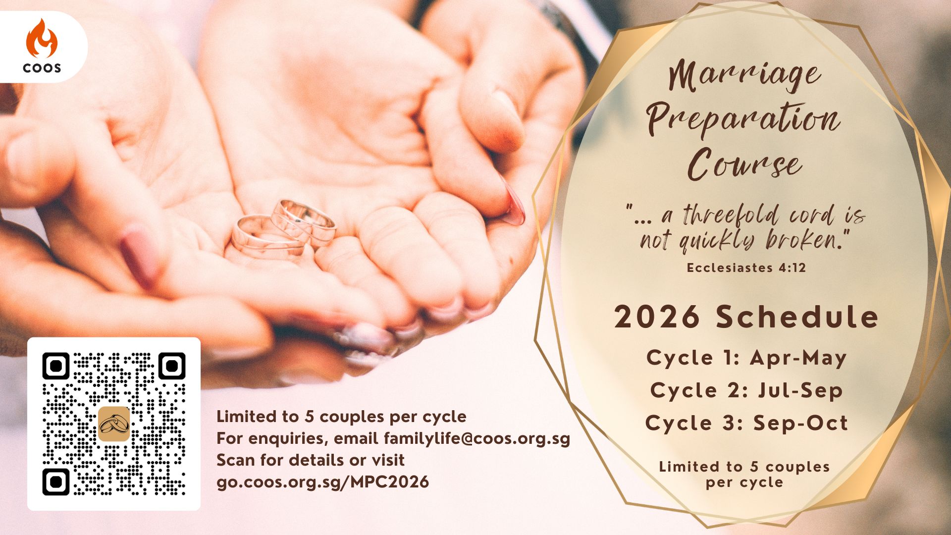 Marriage Preparation Course 2026 Couples thinking about marriage are encouraged to attend the Marriage Preparation Course. The course will help them understand how to lay a strong foundation for their marriage. Please note that the course can only take up to four couples, to allow facilitators and participants optimal time for learning, discussion, and mentoring. […]
