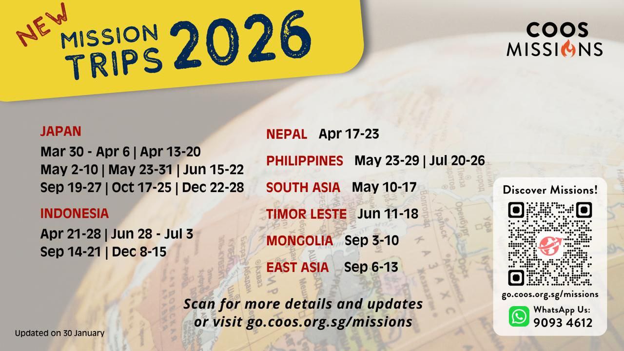 Do visit go.coos.org.sg/missions to learn more about the ministry scope for each trip, costs, etc. For enquiries, WhatsApp message our Missions department at 90934612.
